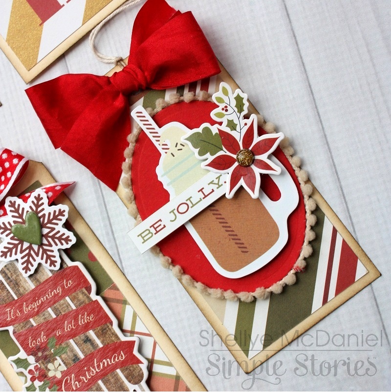 Happy Holiday Greetings! Shellye here to share a quartet of Cozy Christmas shabby chic-style gifting tags with you today. I've pulled together chipboard stickers, cardstock stickers, brads, enamel dots, bits 'n pieces, insta squares and SN@P! cards from the collection, along with a few other basic office supplies from my stash.