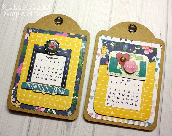 To begin, I cut the patterned paper down to 3.5" X 4.5" and corner rounded them at the bottom so that they matched the kraft tags. Next, one of the 3X4 SN@P cards were added with foam adhesive tape. The calendar was cut down to size, glued in place and then each month was embellished with various pretties!