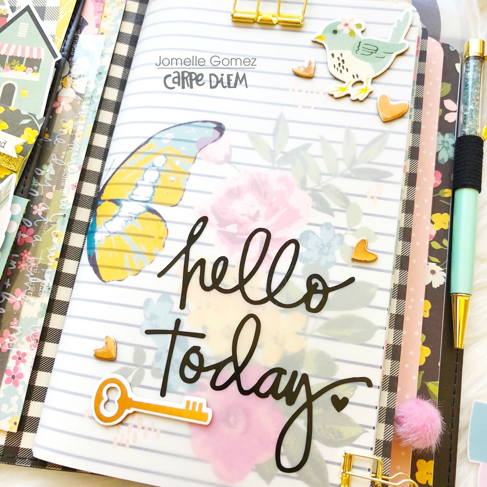 A few stickers and die cuts were also nestled around the clusters just to bring more interest to the page. I added the small, "Hello", circle die cut behind the top corner of the title so that it can read as "HELLO FALL".