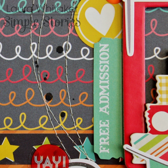 Again I kept my patterned paper layers pretty simple, choosing to pull the grey tones from the collection for a bit more of a grown up look, while still maintaining the playful nature of the collection via my embellishing.
