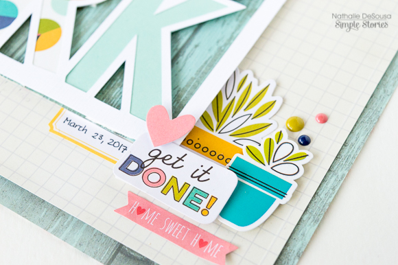 The first layout is all about that dreaded word, "Homework".   The new Domestic Bliss collection, with its vibrant colors, playful papers, and cute embellishments was ideal to bring some cheeriness to the not so happy image homework conveys.
