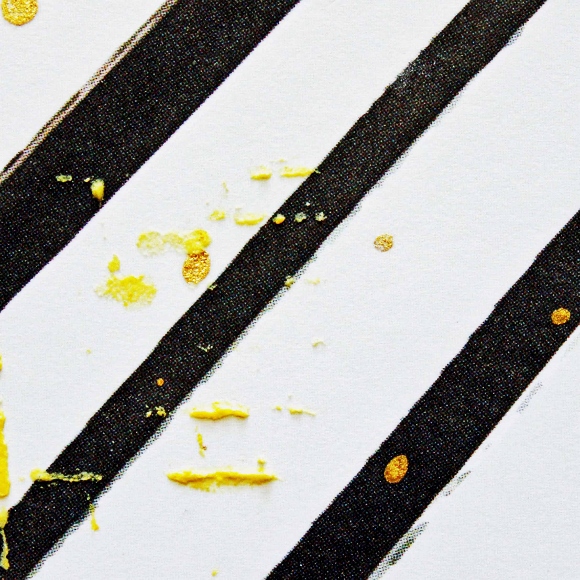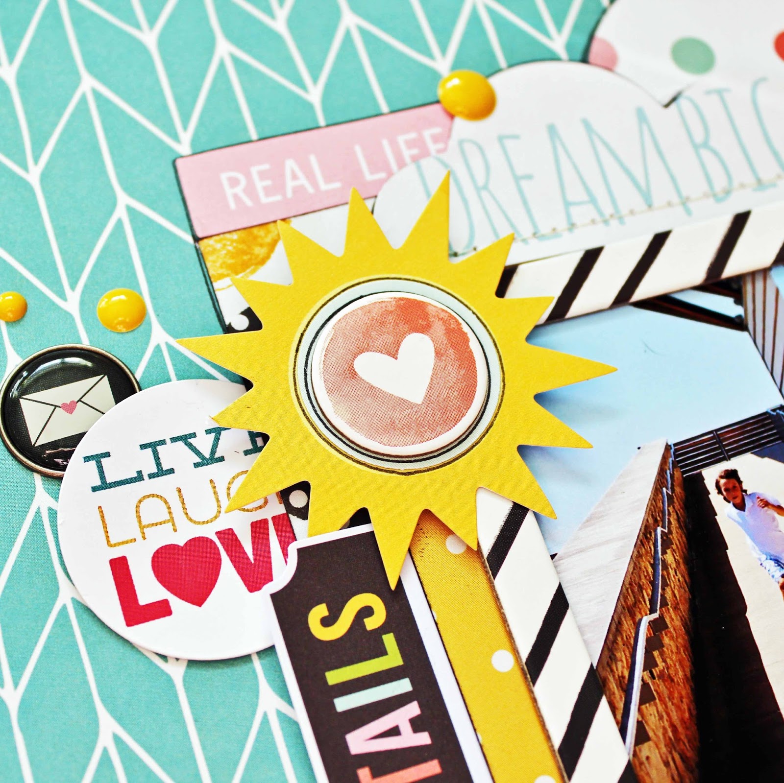 I love this bold black and white diagonal striped paper and NEEDED to use it for my background. I added a bit of texture paste here and there that I coloured with a yellow Gelato and some gold Color Shine. I also cut some triangles from the polka dot / floral paper to adorn two of the corners of my page. I am in serious heart with the bold patterns this collection offers!