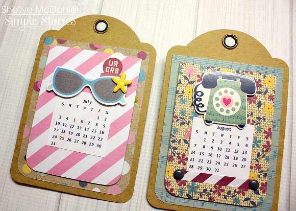 To begin, I cut the patterned paper down to 3.5" X 4.5" and corner rounded them at the bottom so that they matched the kraft tags.  Next, one of the 3X4 SN@P cards were added with foam adhesive tape.  The calendar was cut down to size, glued in place and then each month was embellished with various pretties!